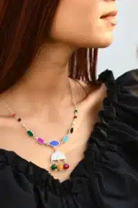 سلسلة من الفضة مع مجموعة متناسقة من الأحجار الملونة مع قالب كتب عليه كلمة ” سعادة”