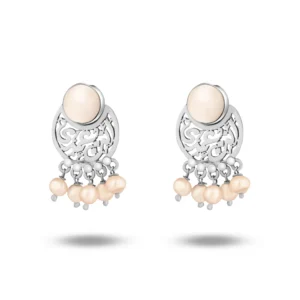 حلق من الفضة، مصمم بشكل نص دائري وبه حبة لؤلؤ مميزة اللون، ومجموعة دلايات من الؤلؤ أيضا بتصميم ناعم.