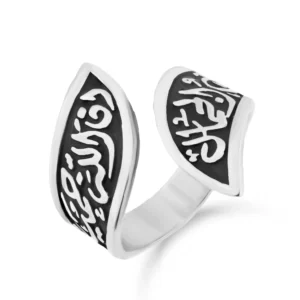 خاتم من الفضة عيار 925 على شكل ورقة الزيتون ومنقوش عليه عبارة بخط عربي